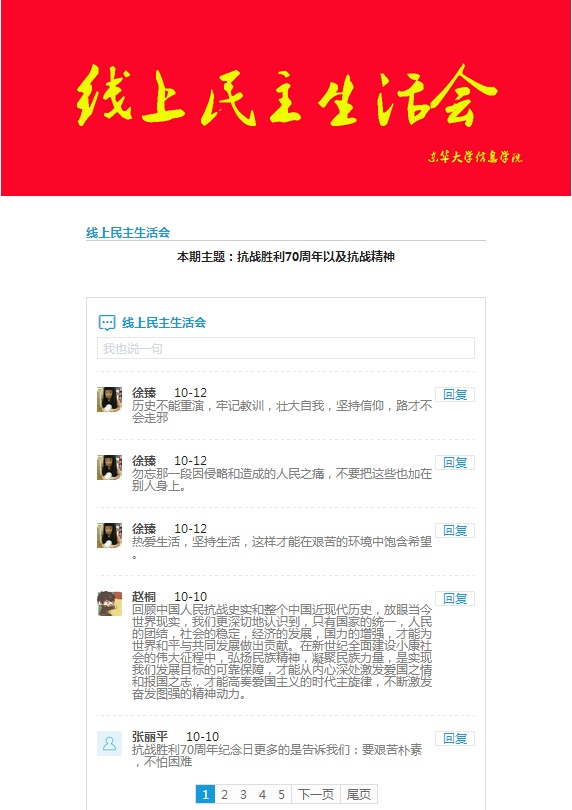 为了纪念中国人民抗日战争暨世界反法西斯战争胜利70周年,结合学院学科特色,信息科学与技术学院入党积极分子党校和学生党支部依托易班平台开辟以“继往开来·‘易’起回顾”为主题的线上专区,开展了一场别开生面的线上民主生活会。平台自10月8日建成开放以来,不断有学生党员、入党积极分子和老师参与交流讨论。