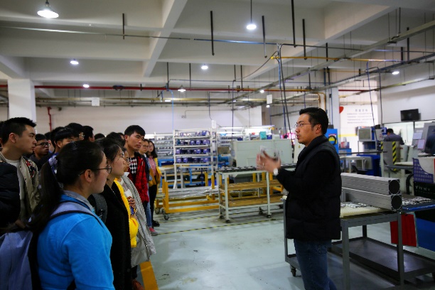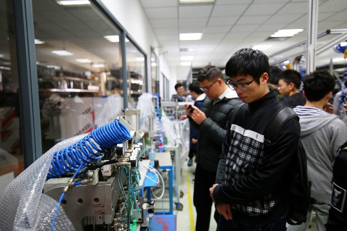 公司产品部经理陆磊杰带领同学们深入工厂内部近距离了解学习。同学们参观了气缸生产车床,生产线上,工人们有条不紊地对原材料进行着精密加工,不同工种的工人来回走动,对产品生产的各个环节反复认真察看。陆经理不时为同学们耐心讲解。望着庞大而又精细的车床,看着复杂而精巧的工序,同学们都看出了神。之后,陆经理带着同学们来到工厂二楼对监测、质检等环节参观学习。其中一套检测仪器会对待测零件自动检测,若检测不通过仪器便亮灯提示,同学们饶有兴趣地围在旁边,看着零件自动检测完成都啧啧称赞。陆经理说,这套先进仪器的背后是完美实现的完备算法,而这正是我们自动化专业的主攻方向之一。在自由参观环节,同学们来到工厂的各个角落寻找好奇的内容,并积极提问。