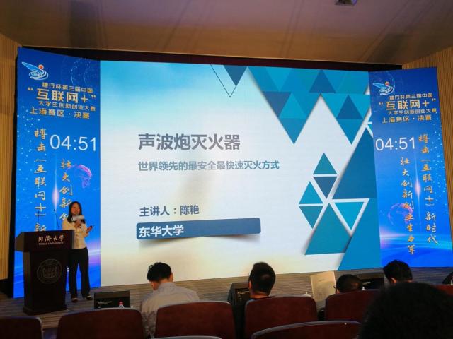今年3月,我校由校团委牵头,教务处、研究生部、学生处、学生就业服务中心、东华镜月资产经营有限公司、上海市大学生科技创业基金会东华分会联合启动了校内赛。校内赛共吸引50个项目参与,经过计划书筛选、校内培训、校内答辩等环节,选送5个项目参加上海赛区复赛。最终《植觉生活——全球首款能感知清洁度的智能纺织品》、《声波炮灭火器》两个项目进入上海市决赛。