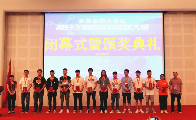 22日上午,举行了大赛闭幕式暨颁奖典礼。材料科学与工程学院党委书记戴蓉、院长朱美芳,“双实”大赛竞赛委员会委员们以及各兄弟院校的领导和师生代表参加闭幕式。戴蓉表示,通过大赛平台,加强高分子专业本科生实践能力和创新能力的培养,勉励同学们将实践本领和竞赛精神传承下去,不断提高。“双实大赛”竞赛委员会秘书长、材料科学与工程国家级实验教学示范中心常务副主任吴文华代表大赛竞赛委员会作总结,他回顾了我校从作为发起单位,到获得材料教指委授权主办,其间走过的十年艰辛筹备之路,并对全国兄弟院校的大力配合表示感谢。