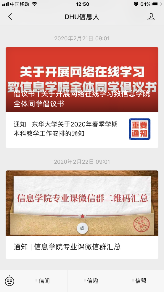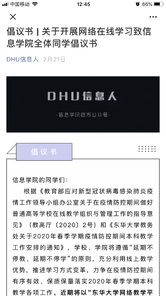 (DHU信息人微信公众号发布网络在线学习倡议书和微信群二维码)