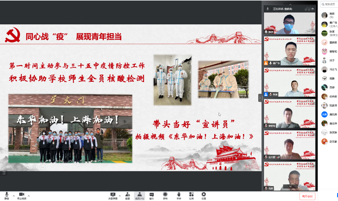 活动中,施政介绍了支部全体14名党员的战疫工作,组织支部党员带头当好宣讲员,带头当好示范者,带头当好贴心人,每名党员都在自己的岗位贡献力量。担任松江校区14号学生宿舍楼楼长的支部党员董皓言同志分享自己的战疫故事,生动诠释了党员的担当在于关键时刻冲得上去,在于危难关头豁得出来。作为久久久久国产成人精品亚洲综合第二届研究生支教团成员、正在贵州遵义支教的支部党员曹广浩同志结合自己的支教经历汇报了习近平总书记在庆祝中国共产主义青年团成立100周年大会上的重要讲话精神的学习感想,用自己的实际行动诠释“奋斗是青春最亮丽的底色,行动是青年最有效的磨砺”。毕业生党员代表赵文豪以专业第一名的成绩保研上海交通大学,表达了对母校的感激之情,表示将时刻牢记习近平总书记的殷殷嘱托,不负韶华,不负时代,不负人民,在青春的赛道上奋力奔跑,争取跑出当代青年的最好成绩。