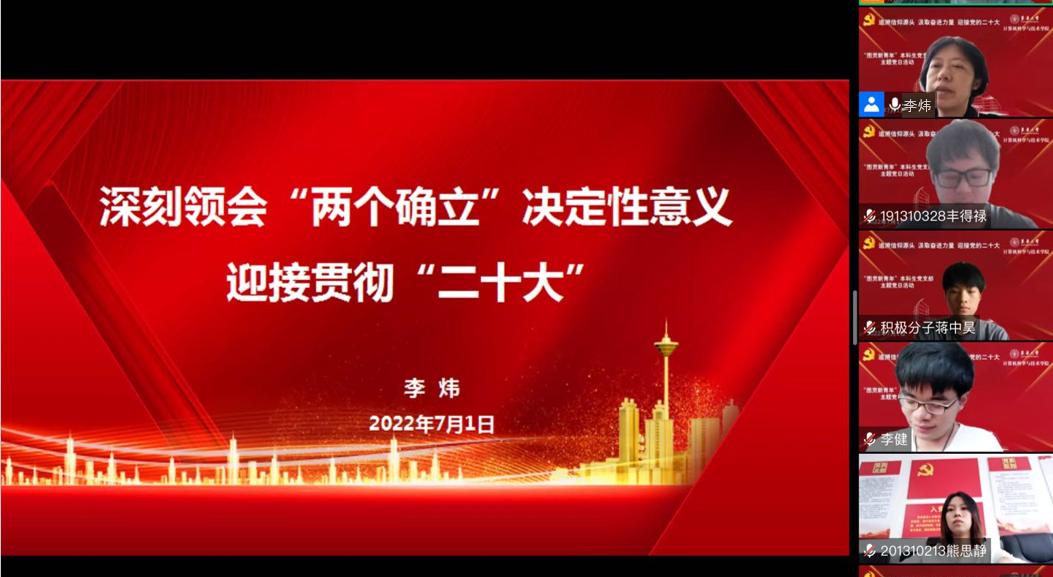 为庆祝中国共产党成立101周年,7月1日,计算机科学与技术学院“图灵新青年”本科生党支部开展“追溯信仰源头,汲取奋进力量,迎接党的二十大”主题党日活动。副校长李炜出席活动并讲党课,学院党委副书记李华婷、党支部全体党员及入党积极分子参加。活动由党支部书记姜霖霖主持。